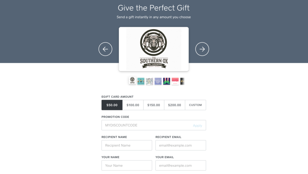 Gift Certificates The Southern Ox gift cards are the perfect gift to give to friends and family members who love axe throwing, competition, or just having a great time! Our current rates are $25 per person per hour and $35 per person for a two hour session.